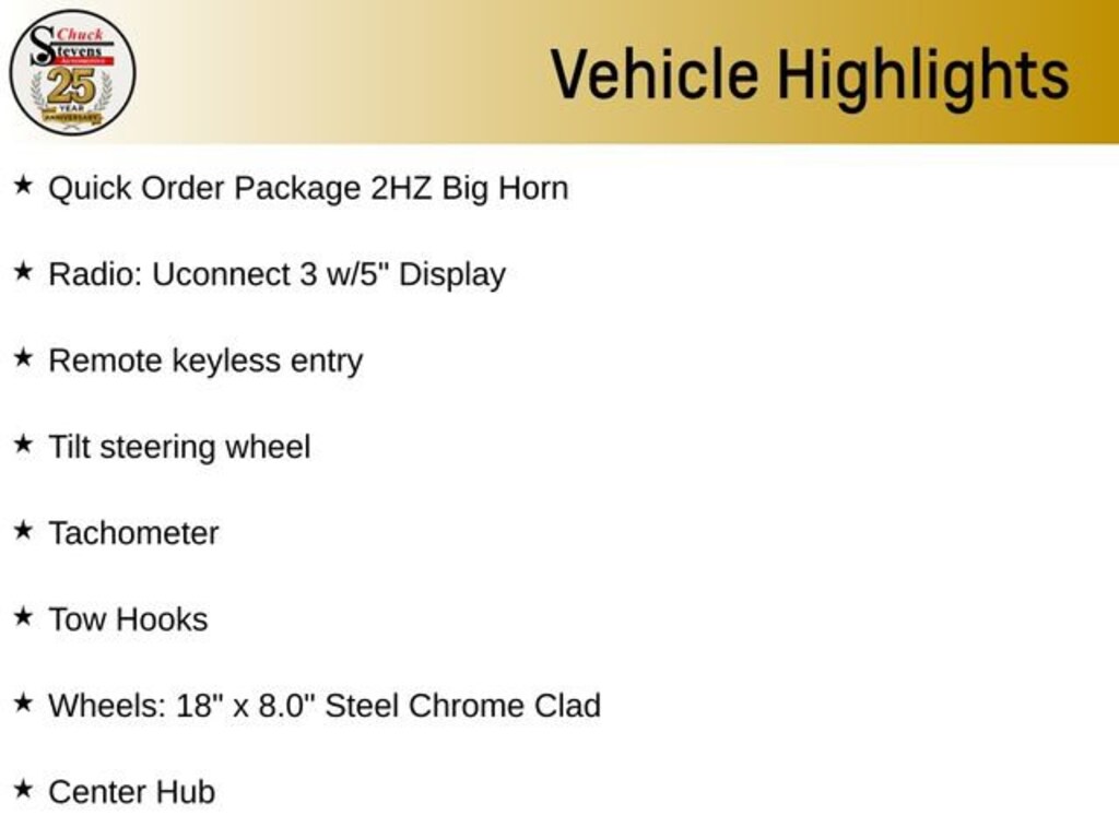 Center Hub, Quick Order Package 2HZ Big Horn, Radio: Uconnect 3 w/5 Display, Remote keyless entry, Tachometer, Tilt steering wheel, Tow Hooks, Wheels: 18 x 8.0 Steel Chrome Clad.