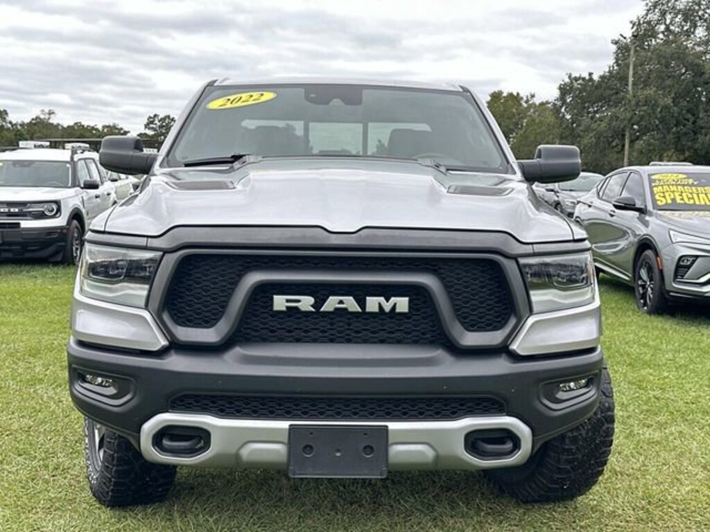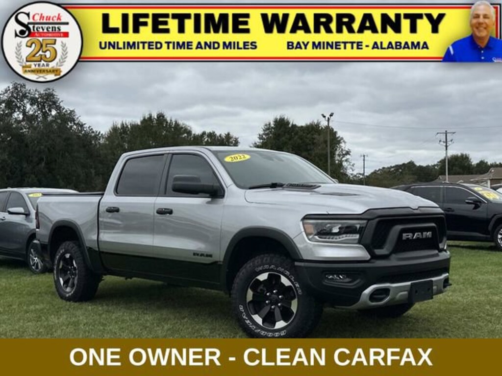 Welcome to Chuck Stevens Chevrolet located on HWY 31 South, Bay Minette Alabama. We are home of Lifetime Powertrain Warranty. A Lifetime Powertrain Warranty at no additional cost.Grab a great deal with our low-price guarantee on this 2022 Ram 1500 Rebel while we still have it. At Chuck Stevens Chevrolet our Pre-Owned vehicles have been fully inspected and reconditioned by a certified technician. The Silver 2022 Ram 1500 Rebel with Silver interior is a wonderful choice.- Tri-Fold Tonneau Cover- Billet Silver Metallic Clearcoat- MOPAR SPRAY IN BEDLINER- Quick Order Package 23W Rebel- AM/FM radio: SiriusXM- Radio: Uconnect 3 w/5 Display- Front fog lights- Fully automatic headlights- 2nd Row In Floor Storage Bins- Telescoping steering wheel- Tilt steering wheel- ParkView Rear Back-Up Camera- Emergency communication system: SiriusXM Guardian- Low tire pressure warning- Alloy wheels- Wheels: 18 x 8.0 Painted Mid-Gloss BlackThis 2022 Ram 1500 Rebel is powered by a 3.6L V6 24V VVT engine mated to an 8-Speed Automatic transmission and 4WD. With an impressive 19 city / 24 highway MPG, this truck offers exceptional efficiency and capability. The Rebel trim level adds rugged off-road features like skid plates, tow hooks, and all-terrain tires, making it the perfect choice for your next adventure.Inside, you'll find a wealth of premium features, including a 5-inch touchscreen infotainment system, SiriusXM satellite radio, and a rearview camera. The spacious cabin offers ample room for passengers and cargo, with 60/40 split-folding rear seats and in-floor storage bins for added versatility.Safety is also a top priority, with features like electronic stability control, traction control, and a suite of airbags to keep you and your loved ones protected on the road.Don't miss your chance to own this well-equipped and capable 2022 Ram 1500 Rebel. Visit Chuck Stevens Chevrolet today and let our knowledgeable sales team guide you through all the features and benefits this truck has to offer.LIFETIME POWERTRAIN WARRANTY PROGRAM is included at no additional charge for all vehicles that have less than 80,000 miles. It is one of the most comprehensive powertrain warranty programs in the market. See dealer for details.