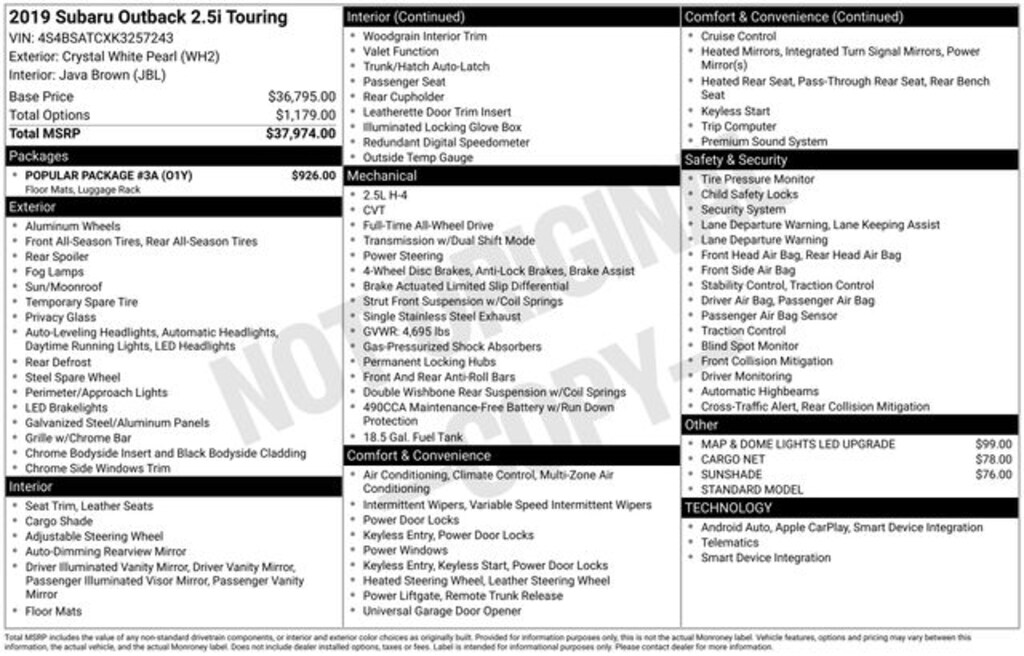 Take advantage of our low-price guarantee on this 2019 Subaru Outback. This Outback comes finished in Crystal White Pearl with a Java interior, making it a fantastic choice for your next vehicle.