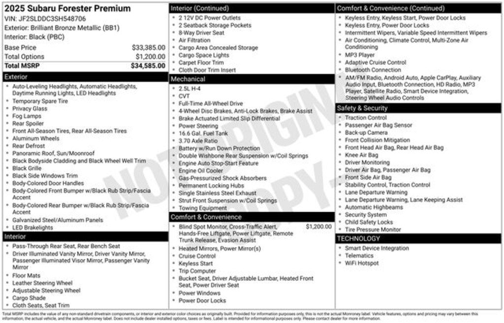Take advantage of our low-price guarantee on this 2025 Subaru Forester. This Forester comes finished in Brilliant Bronze Metallic with a Black interior, making it a terrific choice for your next vehicle.