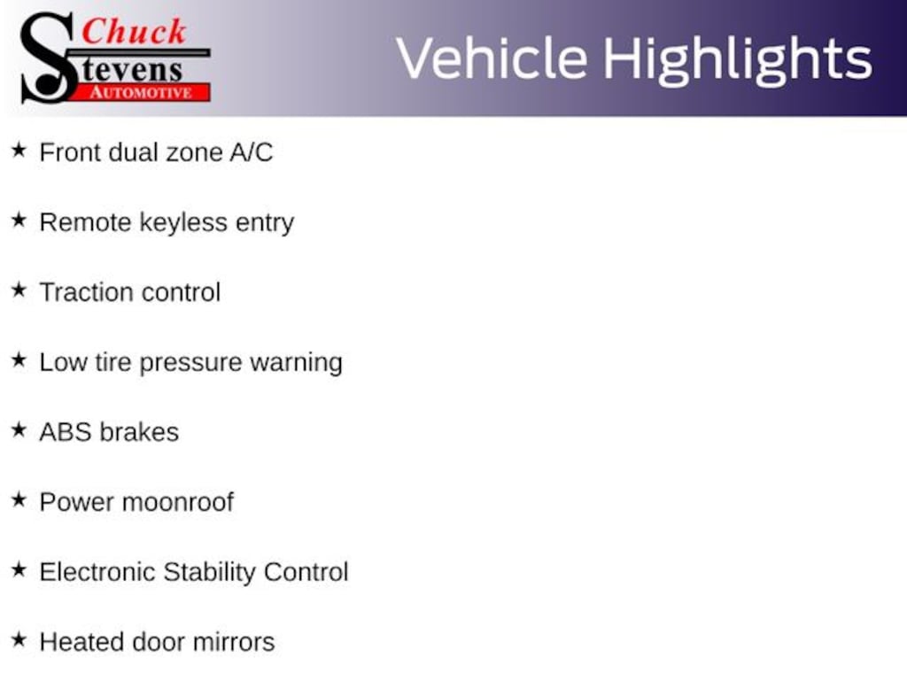ABS brakes, Alloy wheels, Compass, Electronic Stability Control, Front dual zone A/C, Heated door mirrors, Heated Front Bucket Seats, Heated front seats, Illuminated entry, Leather Seat Trim, Low tire pressure warning, Power moonroof, Remote keyless entry, Traction control.
