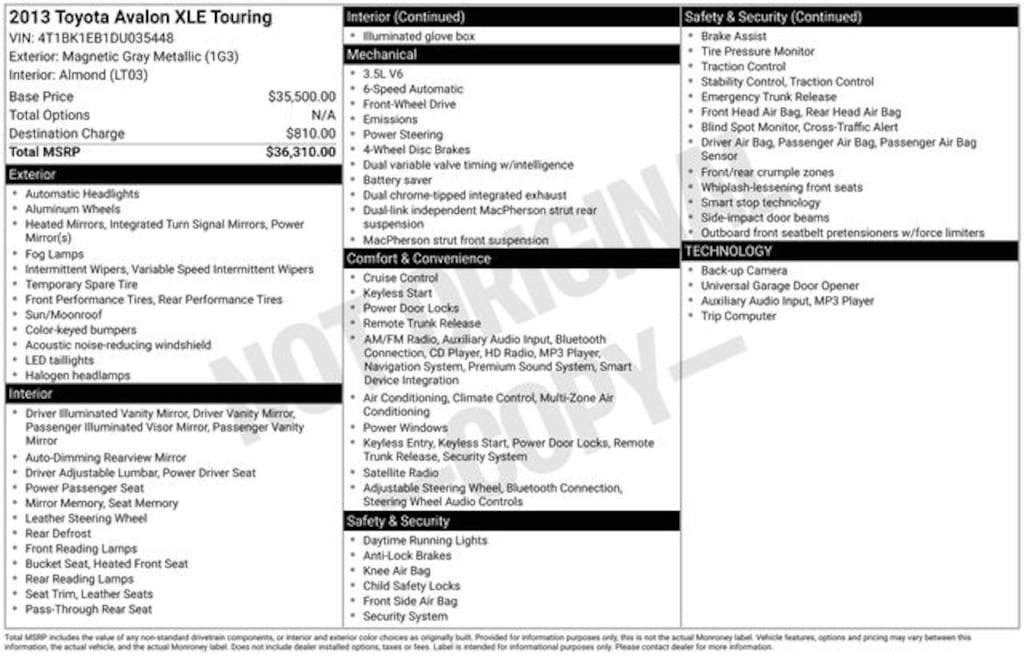 Whether you're looking for a comfortable commuter, a capable road-tripper, or a stylish family sedan, this 2013 Toyota Avalon XLE Touring checks all the boxes. We invite you to come in and experience it for yourself. Our knowledgeable sales team is here to answer any questions you may have and help you find the perfect vehicle to fit your needs and budget.