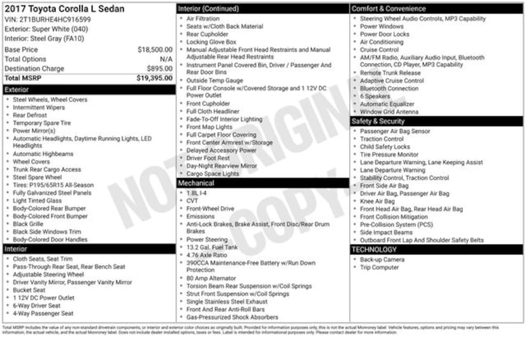 Take advantage of our low-price guarantee on this 2017 Toyota Corolla. This Corolla comes finished in White with an interior, making it an outstanding choice for your next vehicle.