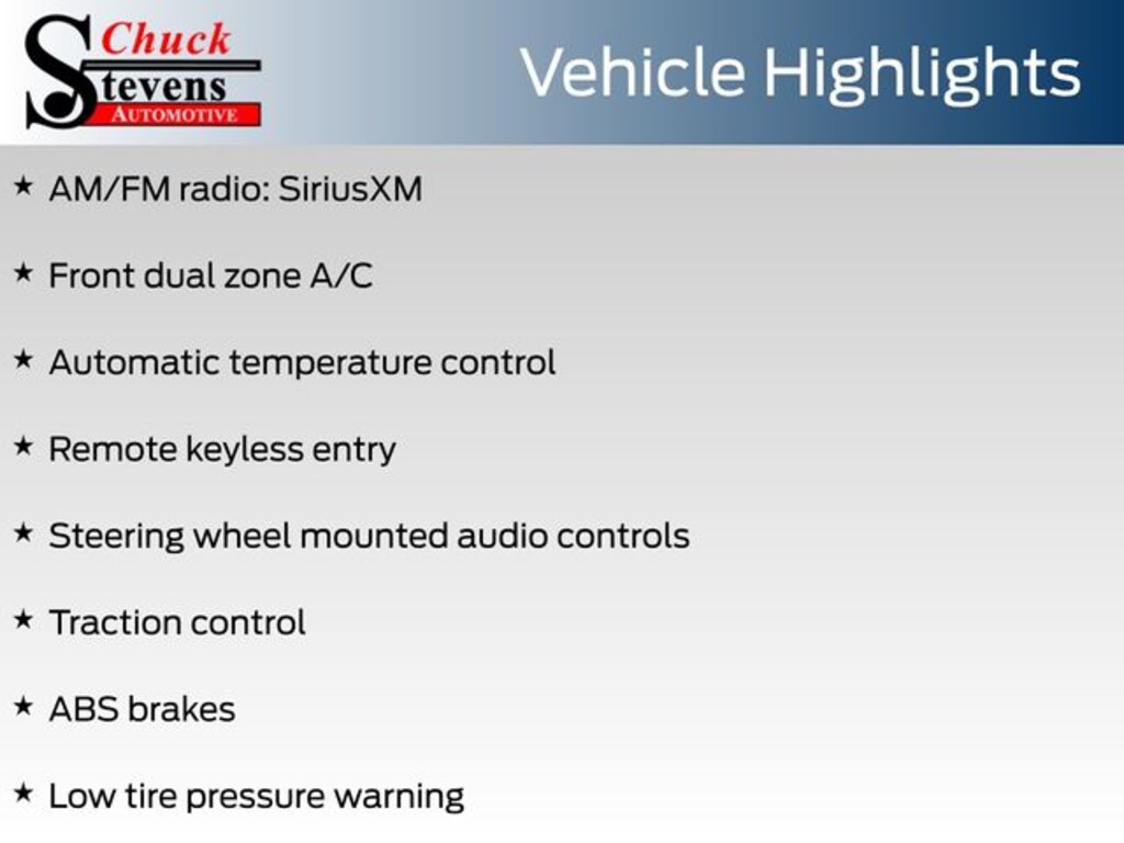 At Chuck Stevens Ford, we also include our exclusive Lifetime Powertrain Warranty at no additional cost. Serviceable at any certified repair facility nationwide.